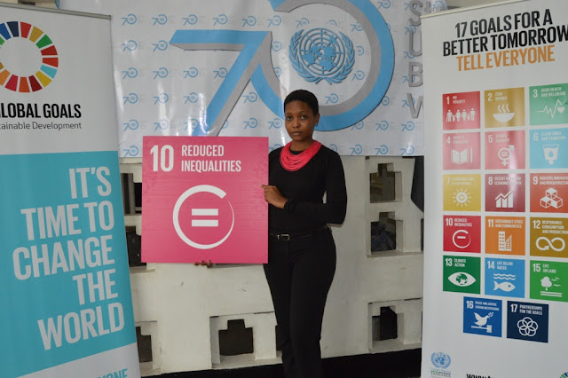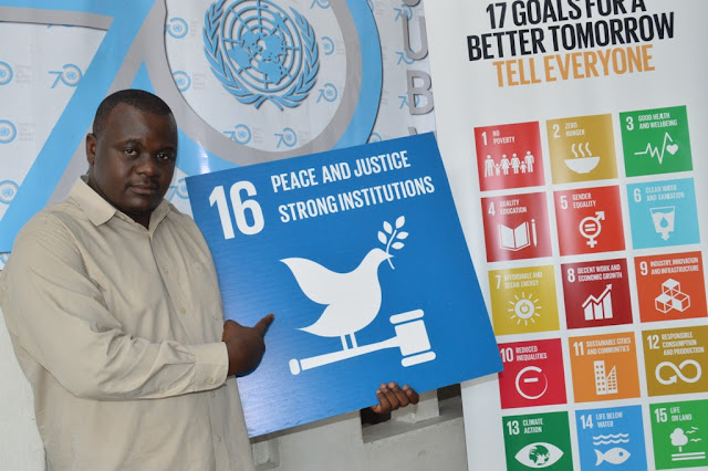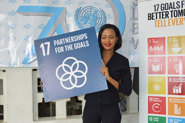 Mtaalam wa Mahusiano na Mawasiliano wa Umoja wa Mataifa (UN) Tanzania, Hoyce Temu akiwa ameshikilia lengo namba 17 kati ya malengo 17 ya Maendeleo Endelevu ya Dunia.