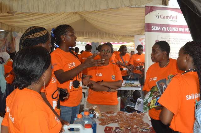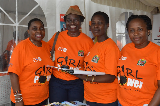 Mgeni rasmi katika maadhimisho ya siku ya mtoto wa Kike Duniani Mkurugenzi wa watoto kutoka Wizara ya Jamii, Jinsia na Watoto Bi. Margaret Sawe Mussai (wa pili kutoka kulia) akipata maelezo kutoka kwa wasichana wajasiriamali alipokuwa anatembelea mabanda.