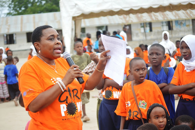 Mgeni rasmi katika maadhimisho ya siku ya mtoto wa Kike Duniani Mkurugenzi wa watoto kutoka Wizara ya Jamii, Jinsia na Watoto Bi. Margaret Sawe Mussai akiwaasa watoto wa kike kuzingatia elimu kwani ndio nguzo ya msingi katika maisha yao wakati w siku ya Mtoto wa Kike Duniani iliyofanyika katika viwanja vya shule ya Tandale jijini Dar. (Picha na Geofrey Adroph wa Pamoja Blog).