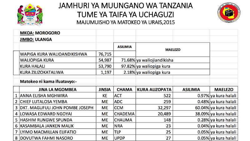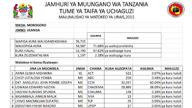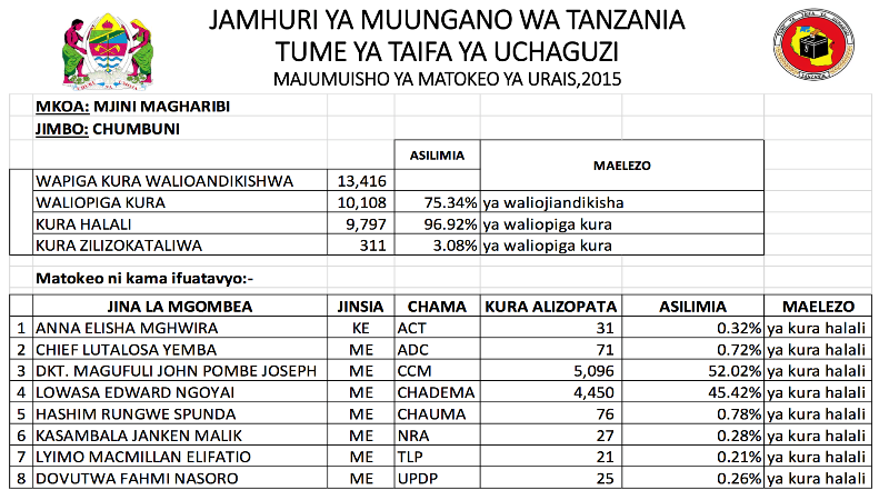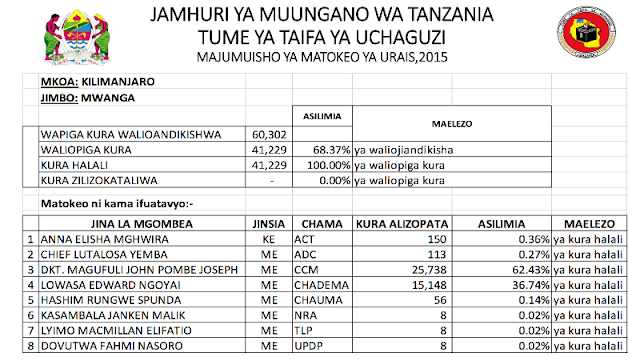 Angalia Matokeo ya Urais Yanayotangazwa na NEC Kama Yalivyotufikia…! Posted on: October 27, 2015 - jomushi