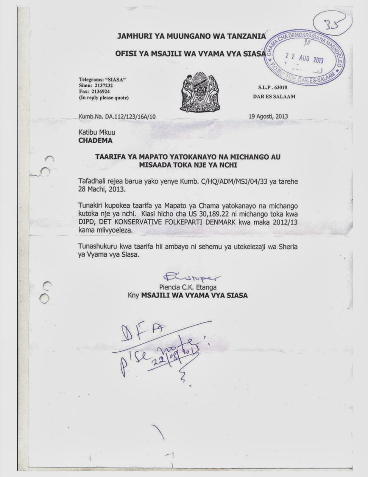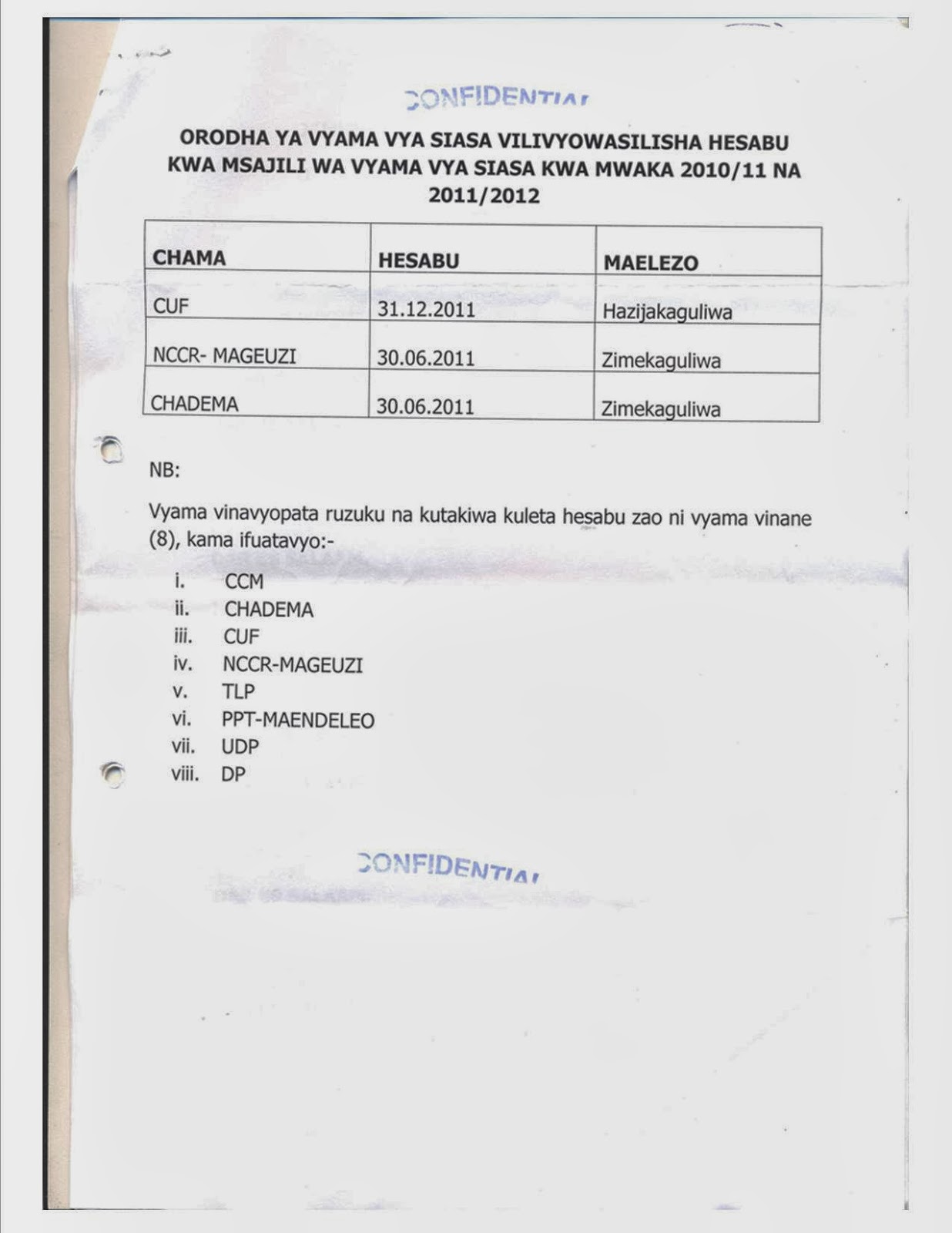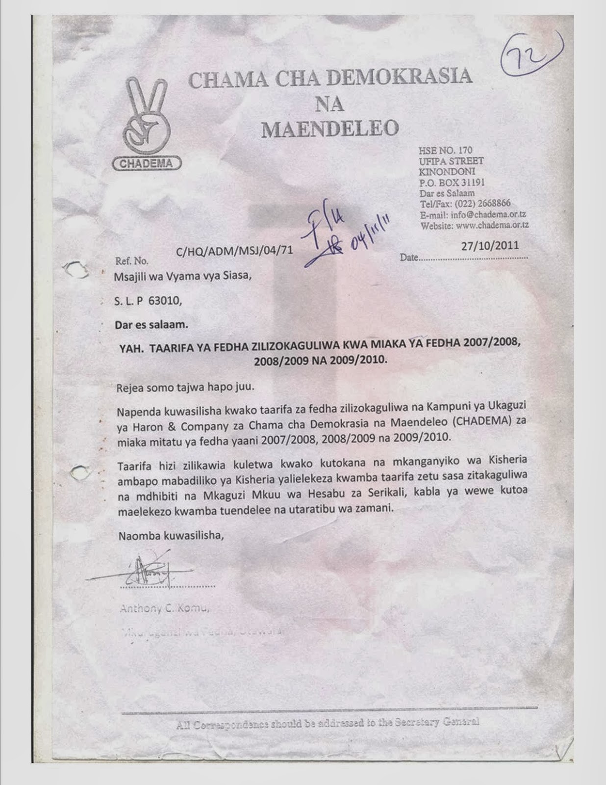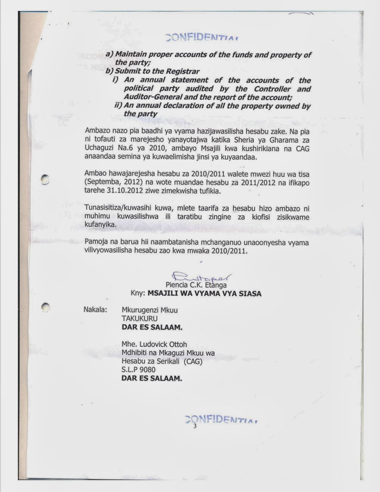 ukaguzi wa mahesabu ya vyama vya siasa, iliyokuwa inajibu barua