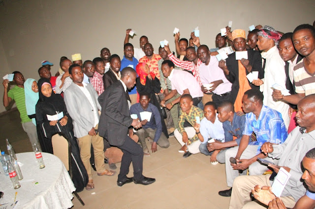 Mwenyekiti wa Baraza la Vijana wa , Juvicuf, ambaye pia ni Mbunge wa Mchinga Hamidu Bobal (kushoto), akikabidhi kadi kwa wanafunzi hao.