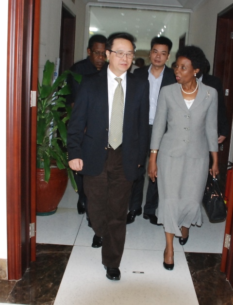 Katibu wa NEC ya CCM, Siasa na Uhusiano wa Kimataifa, Dk. Asha-Rose Migiro akizungumza na Mjumbe wa Kamati Kuu na Mwenyekiti wa Uhusiano wa Kimataifa wa Chama Cha Kimomunisti Cha Viatnam (CPV), Hoang Binh Quan, baada ya kumpokea kwenye Uwanja wa Ndege wa Julius Nyerere asubuhi hii. (PICHA ZOTE NA BASHIR NKOROMO)