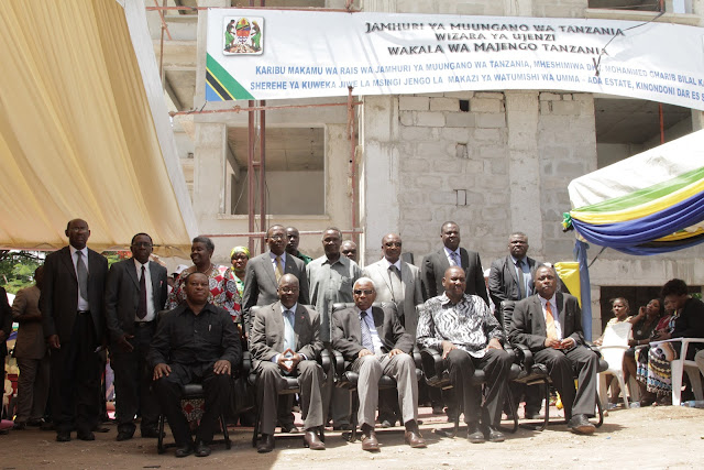 Makamu wa Rais wa Jamhuri ya Muungano wa Tanzania, Dk. Mohammed Gharib Bilal, na Waziri wa Ujenzi, Dk. John Magufuli, kwa pamoja wakifunua kitambaa kuashiri uwekaji wa Jiwe la Msingi katika Ujenzi wa Nyumba za Makazi ya Watumishi wa Umma, zilizopo eneo la Ada Estate, jijini Dar es Salaam, wakati wa hafla hiyo iliyofanyika.