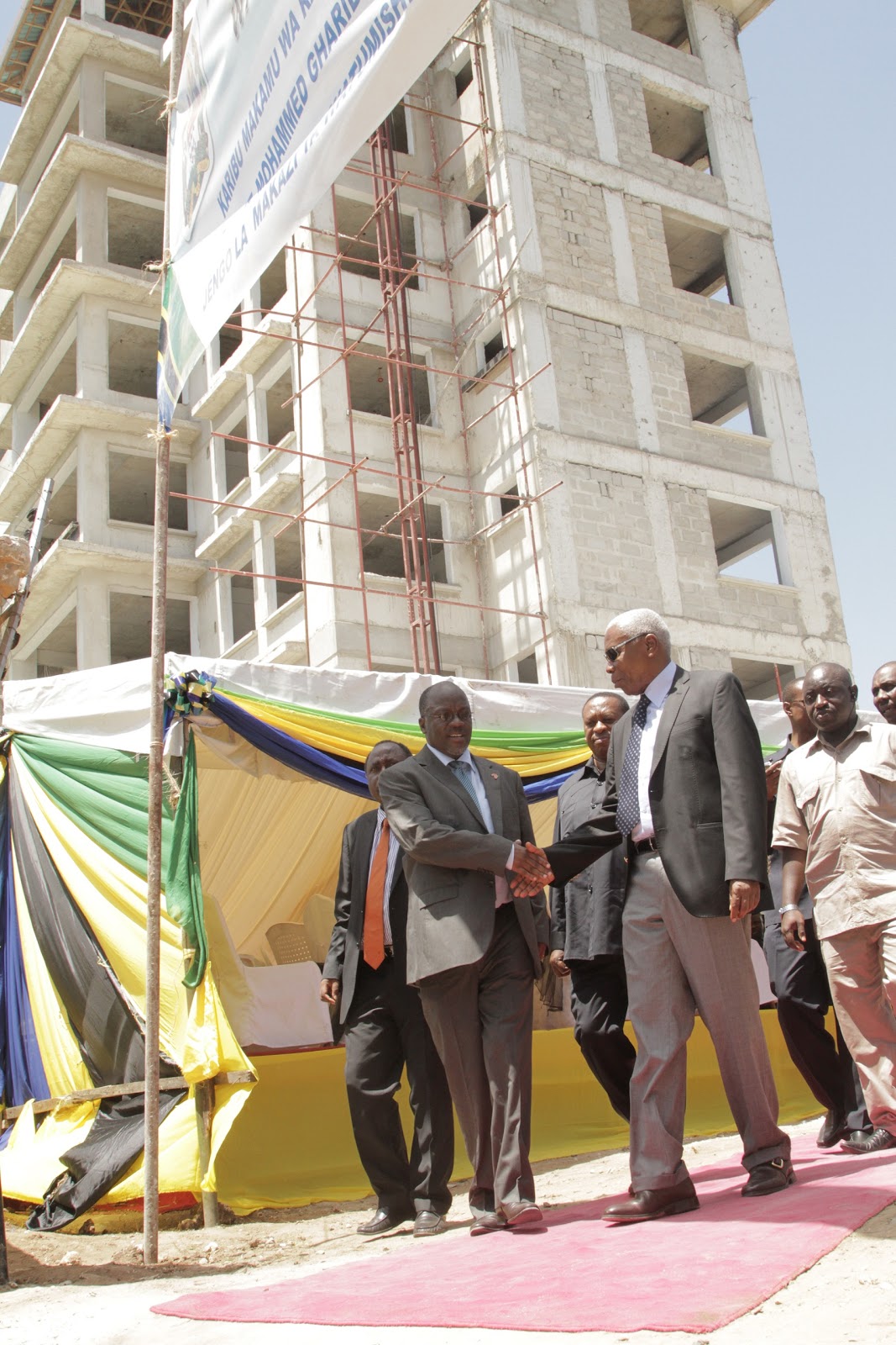 Makamu wa Rais wa Jamhuri ya Muungano wa Tanzania, Dk. Mohammed Gharib Bilal, akiongozwa na Mtendaji Mkuu wa Wakala wa Majengo Tanzania (TBA) Elius Mwakalinga, wakati akitembelea kukagua maendeleo ya ujenzi wa Nyumba za Makazi ya Watumishi wa Umma, zilizopo eneo la Ada Estate, jijini Dar es Salaam, wakati wa hafla ya uwekaji wa Jiwe la Msingi katika Ujenzi wa jengo hilo.