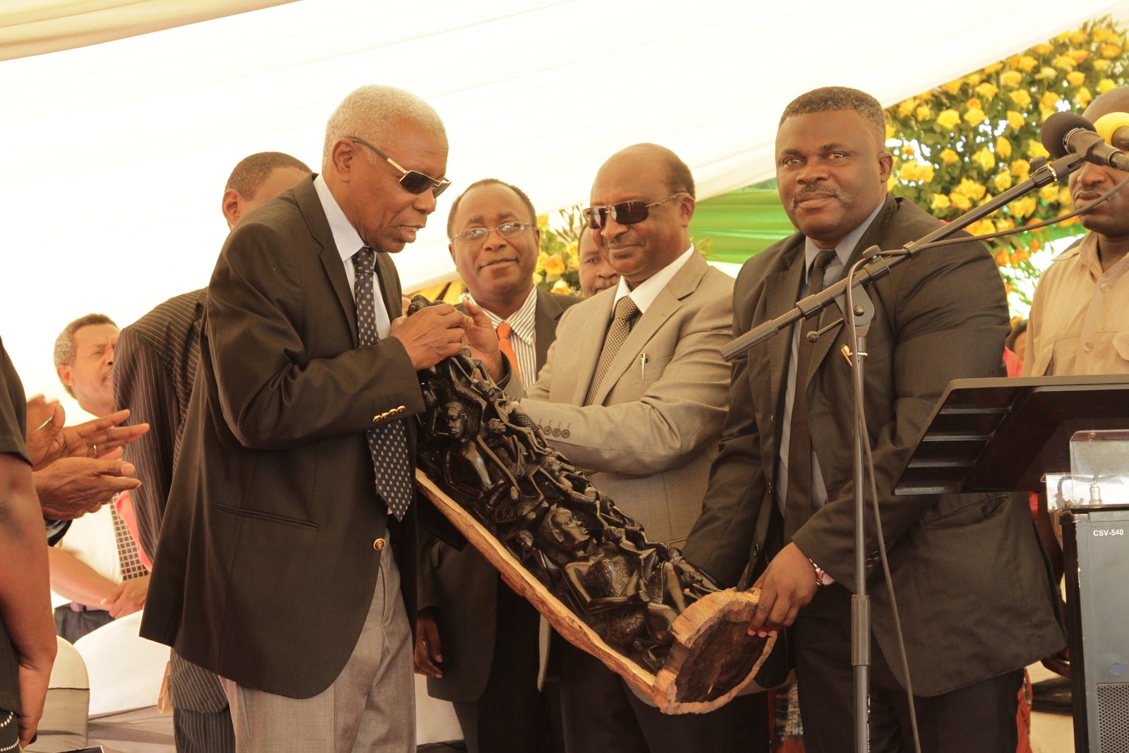 Makamu wa Rais wa Jamhuri ya Muungano wa Tanzania, Dk. Mohammed Gharib Bilal, akipokea zawadi ya sanamu la Kinyago cha Umoja, kutoka kwa Mtendaji Mkuu wa Wakala wa Majengo Tanzania (TBA) Elius Mwakalinga (kulia) na Mwenyekiti wake, Edward Ngwalle, (wa pili kulia) wakati wa hafla ya uwekaji wa Jiwe la Msingi katika Ujenzi wa Nyumba za Makazi ya Watumishi wa Umma, zilizopo eneo la Ada Estate, jijini Dar es Salaam.
