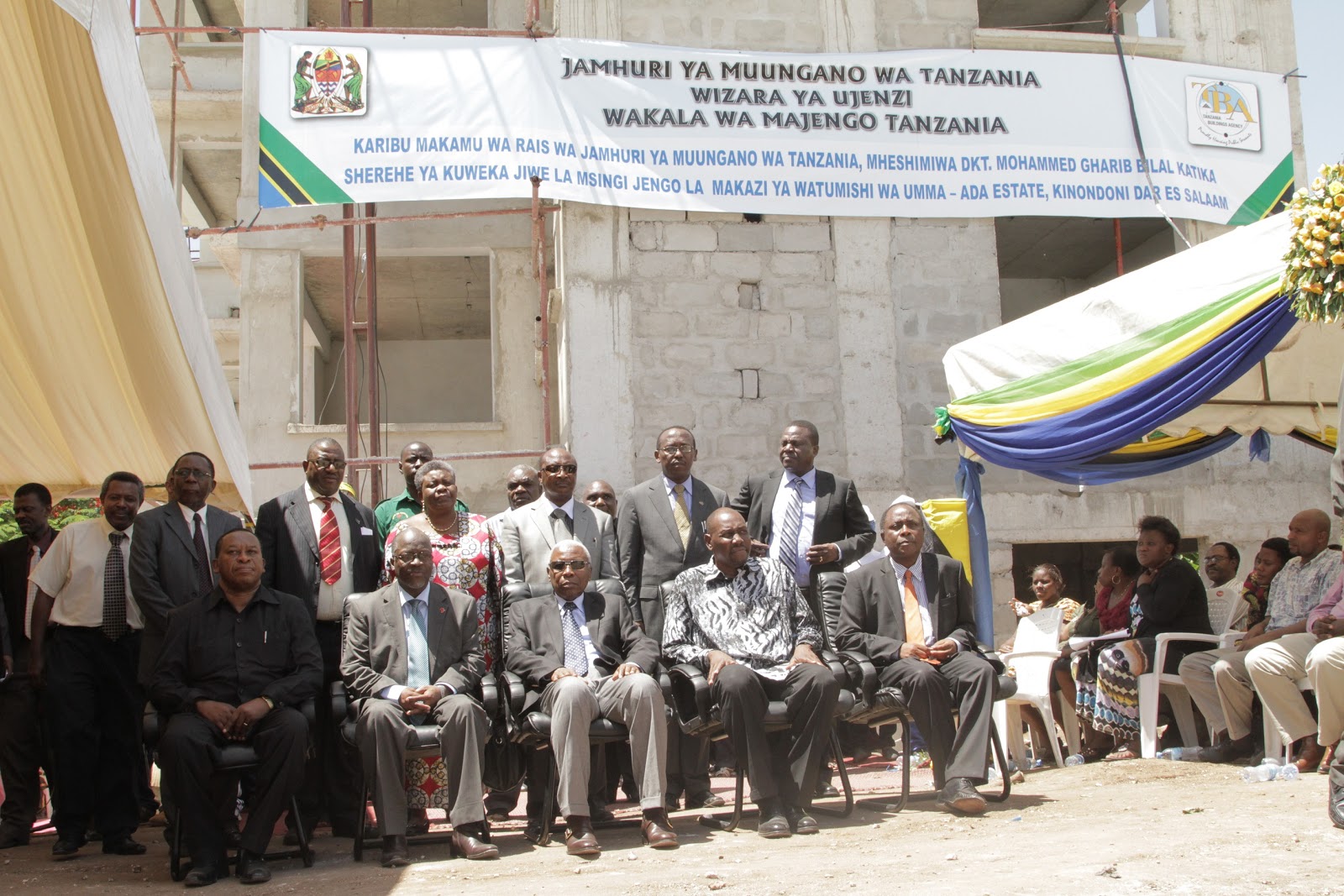 Makamu wa Rais wa Jamhuri ya Muungano wa Tanzania, Dk. Mohammed Gharib Bilal, na Waziri wa Ujenzi, Dk. John Magufuli, kwa pamoja wakifunua kitambaa kuashiri uwekaji wa Jiwe la Msingi katika Ujenzi wa Nyumba za Makazi ya Watumishi wa Umma, zilizopo eneo la Ada Estate, jijini Dar es Salaam, wakati wa hafla hiyo iliyofanyika.