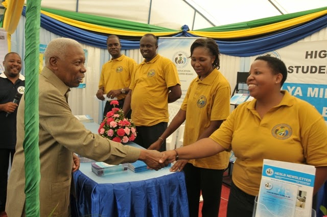 Makamu wa Rais Dk. Mohamed Gharib Bilali leo Aprili 16, 2014 ametembelea viwanja vya Mnazi Mmoja jijini Dar es Salaam kujionea maonesho ya Miaka 50 ya Muungano yanayoendelea katika vuiwanja hivyo. Miongoni mwa mabanda aliyotembelea ni banda la Bodi ya Mikopo ya Wanafunzi wa Elimu ya Juu (HESLB) na pichani ni Makamu wa Rais akikaribishwa bandano hapo na Kaimu Mkurugenzi Mtendaji wa HESLB, Asangye Bangu.