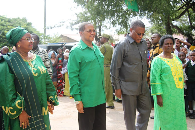 Mwenyekiti wa CCM, Rais Mstaafu Jakaya Kikwete akisubiri kuvalishwa skafu baada ya kuwasili Ofisi ya CCM mkoa wa Singida leo. Kushoto ni Mama Salma Kikwete. na Kulia ni Kaimu Katibu wa CCM mkoa wa Singida Mary Maziku na Katibu wa NEC Itikadi na Uenezi, Mbunge wa Mtama, Nape Nnauye.
