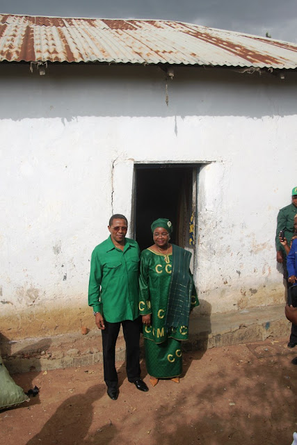 Mwenyekiti wa CCM, Rais Mstaafu Jakaya Kikwete akipiga picha na mke wake Mama Salma Kikwete, leo, mbele ya nyumba ambamoishi mjii Singida mwaka 1975, wakati huo akiwa katibu Msaidizi wa TANU wilaya ya Singida mjini. Kikwete yupo mkoani Singida kwa ajili ya kuongoza Maadhimisho ya Miaka 39 ya CCM, abayo kilele chake kitaifa ni kesho