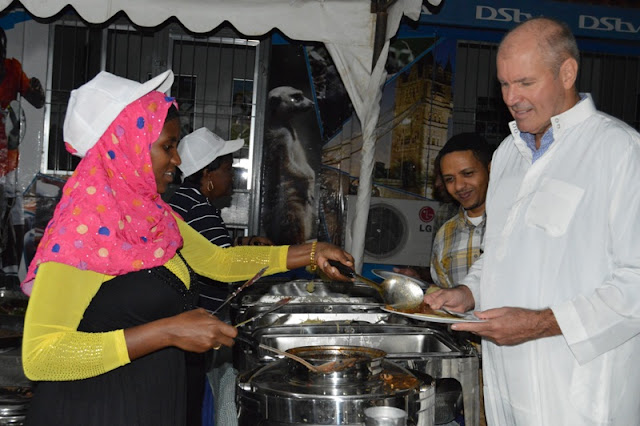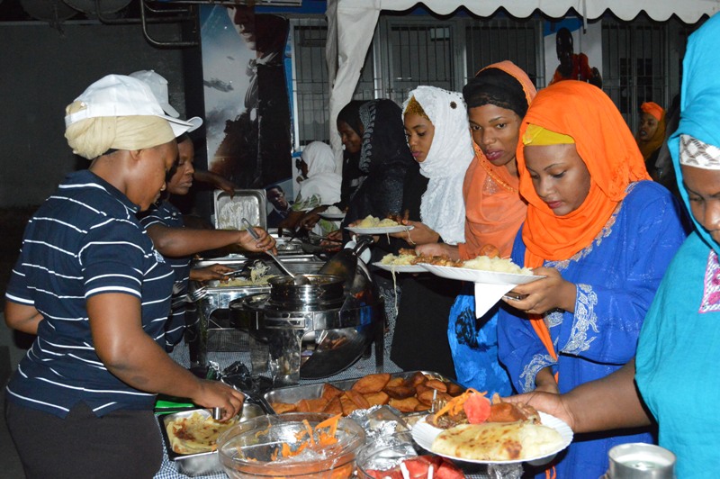 Mkurugenzi wa Multichoice Tanzania, Peter Fauel akichukua chakula wakati wa kuwafuturisha watoto yatima wanaolelewa katika kituo cha Al-Madina kilichopo Tandale kwa Tumbo, Wa pili kutoka kulia ni Meneja uendeshaji wa Multichoice Tanzania, Ronald Shelukindo.