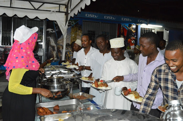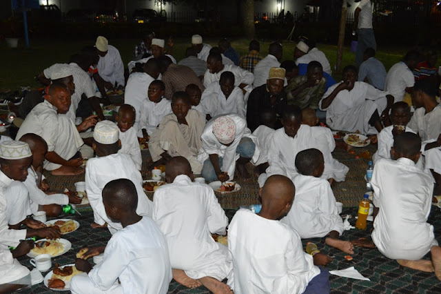 Baadhi ya Watoto yatima, Wafanyakazi wa Multichoice Tanzania pamoja na viongozi wa kituo hicho cha Al-Madina wakichukua chakula katika futari iliyoandaliwa na kampuni ya Multichoice Tanzania.