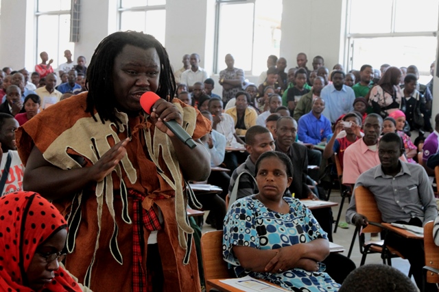 Mkali wa kughani mashairi hapa nchini, Mrisho Mpoto akifafanua jambo mbele ya wakazi mbalimbali wa mji wa Mbeya, alipokuwa akiielezea mada mojawapo iliyohusiana na fursa mbalimbali zilizomo ndani ya mkoa huo namna ya kuzitumia,Semina hiyo imefanyika leo ndani ya ukumbi wa chuo cha Teofilo Kisanji kilichopoo maeneo ya Block T – Mama John mkoani Mbeya.