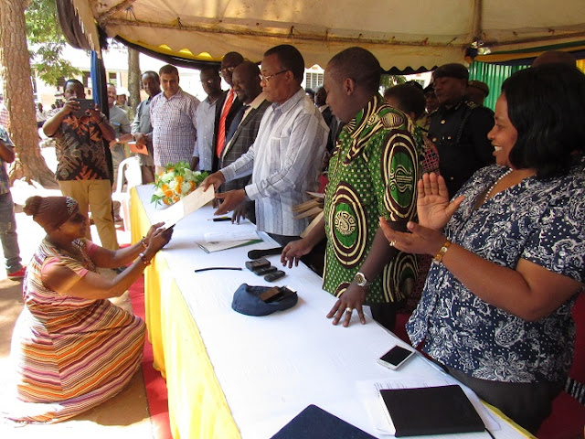 Waziri wa Ardhi, Nyumba na Maendeleo ya Makazi, Mhe.Willium Lukuvi, akimkabidhi hati ya umiliki wa ardhi na makazi mmoja wa wakazi wa Kata ya Buhongwa Jijini Mwanza ambaye makazi yake yamerasimishwa kutoka makazi holela baada ya zoezi la upimaji kufanyika.