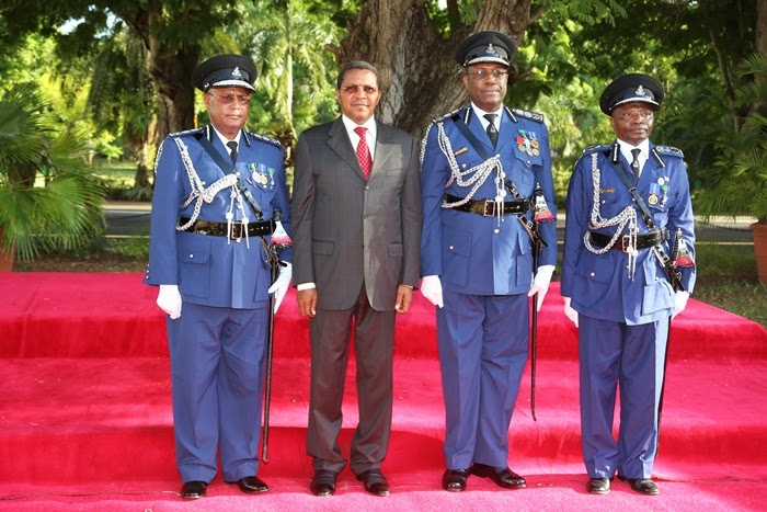 Rais Jakaya Mrisho Kikwete akiwa katika picha ya pamoja na IGP mpya Afande Ernest Mangu, Naibu Inspekta Generali wa Polisi (IGP) mpya Afande Abdulrahman Kaniki katika viwanja vya Ikulu jijini Dar es Salaam. PICHA NA IKULU.