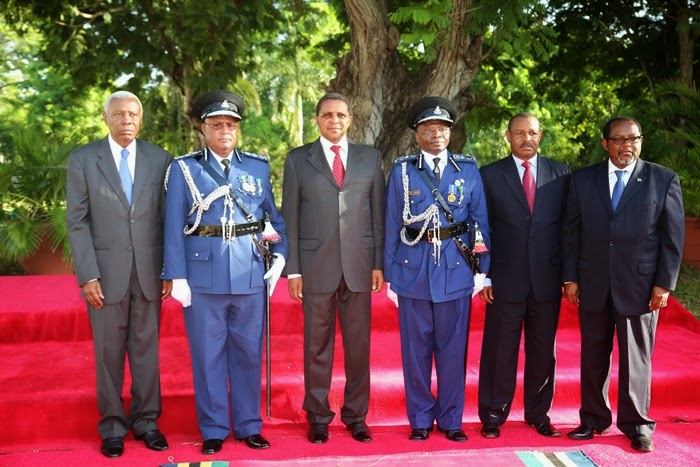 Rais Jakaya Mrisho Kikwete, Makamu wa Rais Dk. Mohamed Ghalib Bilali na Katibu Kiongozi Balozi Ombeni Sefue katika picha ya pamoja na Inspekta Generali wa Polisi (IGP) mpya Afande Ernest Mangu na naibu wake Naibu IGP Afande Abdulrahman Kanini katika viwanja vya Ikulu jijini Dar es Salaam.