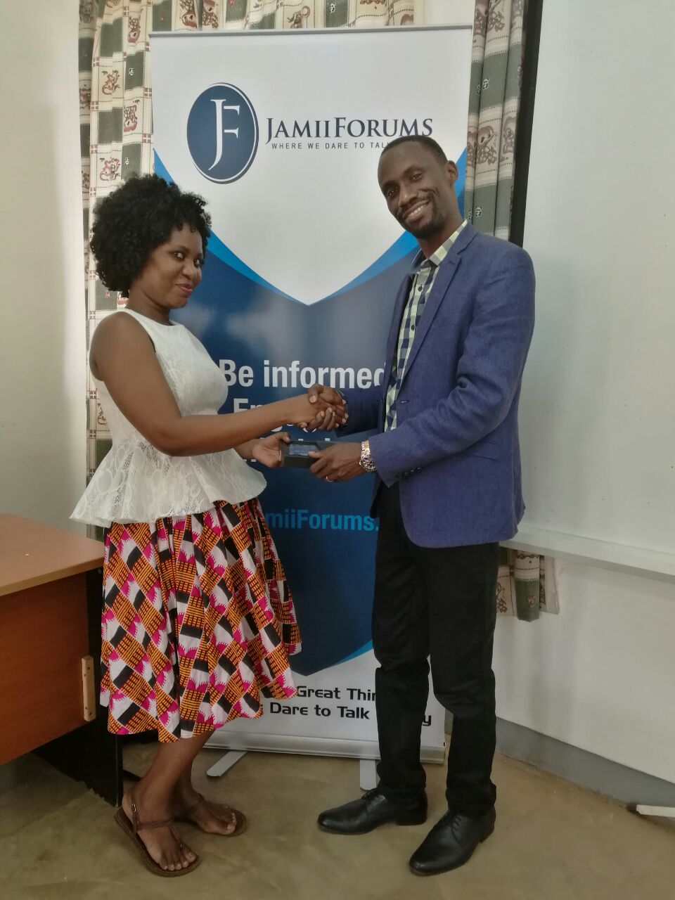 Mkurugenzi Mtendaji wa Jamii Media, Bw. Maxence Melo akimkabidhi kitendea kazi mwakilishi wa JamiiForums (Afisa Mawasiliano) katika Jimbo la Bukoba Mjini, Bi. Happiness Essau.