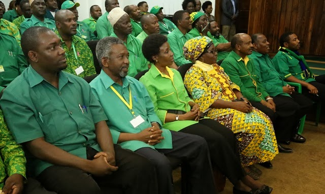 Ukumbi ukilipuka kwa mbinje, nderemo na vifijo, Mwenyekiti wa CCM, Rais Jakaya Kikwete alipowasili ukumbini, Makao Makuu ya CCM, mjini Dodoma kufunga mafunzo ya watendaji na viongozi wa CCM.
