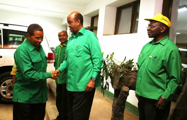 Katibu Mkuu wa CCM, Abdulrahman Kinana akimpokea Mweneyekiti wa CCM, Rais Jakaya Kikwete alipowasili Makao Makuu ya CCM, Jengo la White House, mjini Dodoma, kufunga mafunzo kwa watendaji na viongozi wa CCM ngazi za wilaya na mikoa, Oktoba 24, Kulia ni Makamu Mwenyekiti wa CCM (Bara) Philip Mangula.