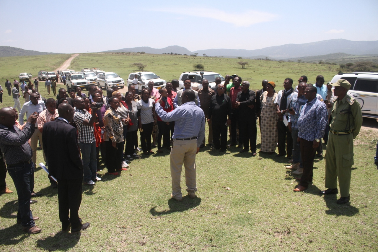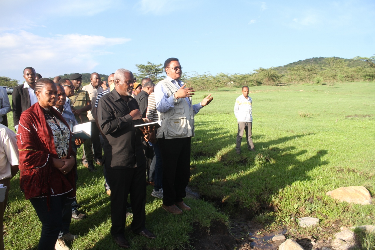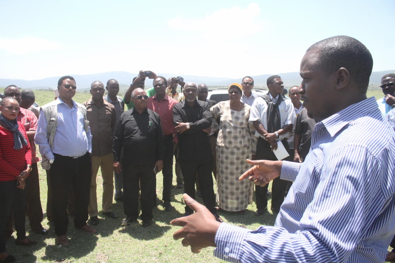 Mtafiti Mkuu wa Idara ya Ikolojia (TAWIRI) Dkt Edward Khoi akitoa maelezo ya kitaalamu kwa wajumbe wa kamati ya kudumu ya Ardhi, Malisili na Utalii wakati wakitembela Pori tengefu la Loliondo.