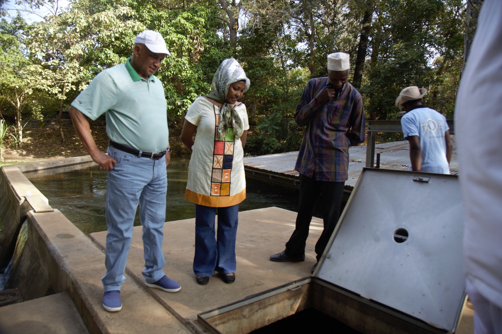 Mkuu wa wilaya ya Hai, Gelasius Byakanwa (kushoto) Mkuu wa wilaya ya Moshi Kippi Warioba (anayefuatia pamoja na Mkuu wa mkoa wa Kilimanjaro wakitizama eneo ambalo kunafanyika mgawanyo wa maji katika chanzo cha maji cha Shiri Njoro.