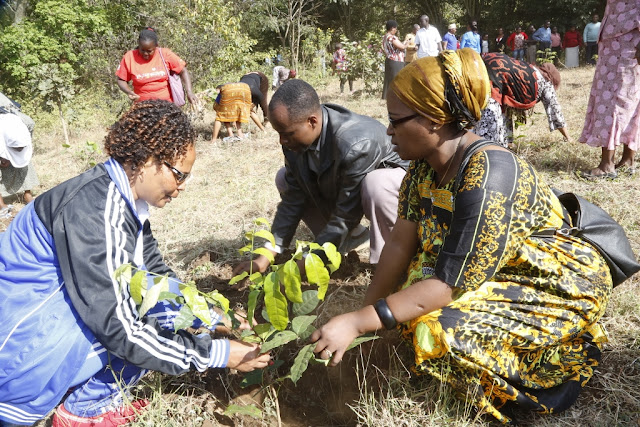 Mkurugenzi wa Mamlaka ya Majisafi na Usafi wa Mazingira mjini Moshi (MUWSA) Joyce Msiru akiotesha mti katika eneo hilo.