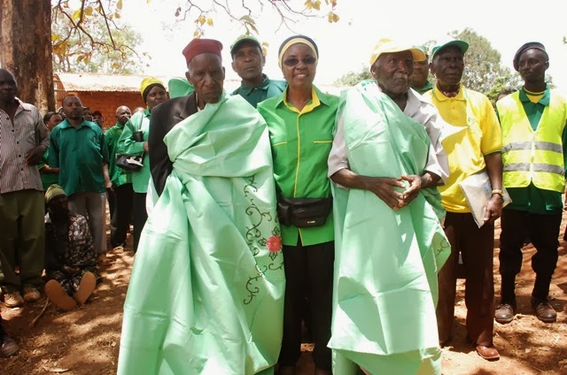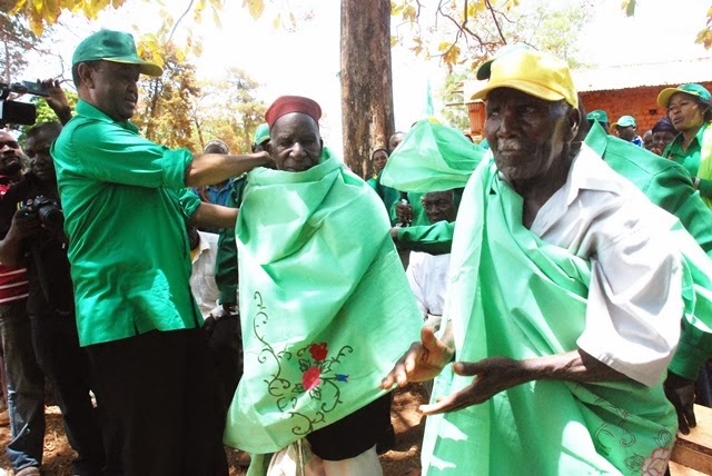 Wazee pekee wawili walisosalia kati ya waliokuwepo kwenye mkutano wa Baba wa Taifa Mwalimu Nyerere wakati wa harakati za TANU, mwaka 1957 katika eneo la Matogolo, Songea mkoani Ruvuma, Hashim Gawaza (92) na Clemence Simon Nyoni (93), wakivishwa vazi la heshima na Katibu Mkuu wa CCM, Abdulrahman Kinana, alipowasili eneo hilo leo