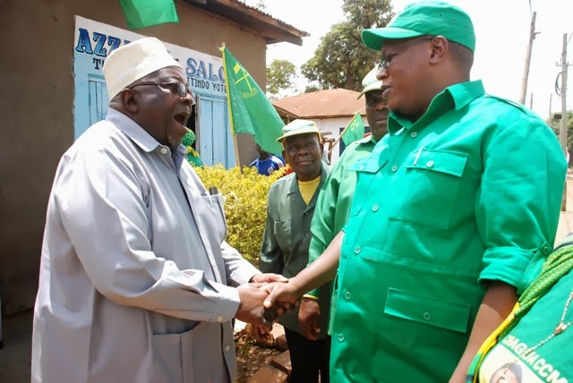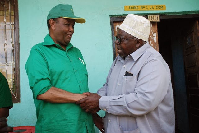 Katibu Mkuu wa CCM, Abdulrahman Kinana akisalimiana na muasisi wa TANU na baadaye CCM, Mzee Mustafa Songambele, baada ya kuzungumza na wanachama kwenye shina namba moja mjini Songea