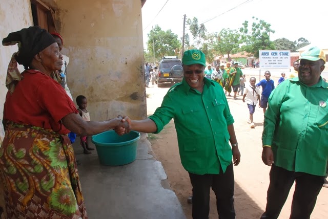Katibu wa NEC, Itikadi na Uenezi, Nape Nnauye akimsalimia mama huyu, Mkazi wa mtaa wa Mfaranyaki mjini Songea, baada ya kumuona kuwa mwenye shangwe kubwa wakati msafara wa Kinana ulipopita karibu na nyumbani kwa mkazi huyo.