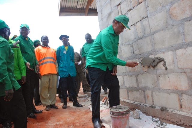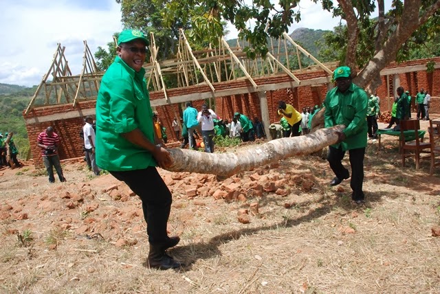 Katibu Mkuu wa CCM, Abdulrahman Kinana akishiriki ujenzi wa nyumba ya mwalimu kwenye shule ya sekondari Mdandamo wilayani Songea mjini