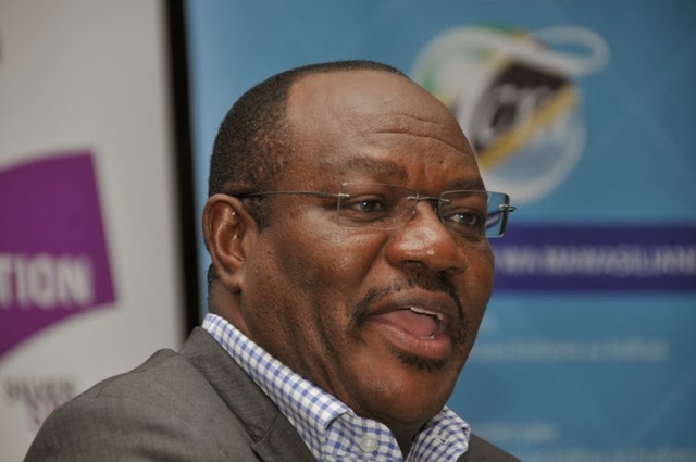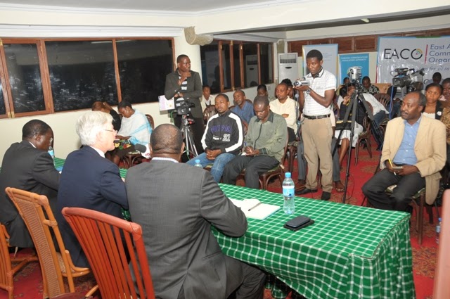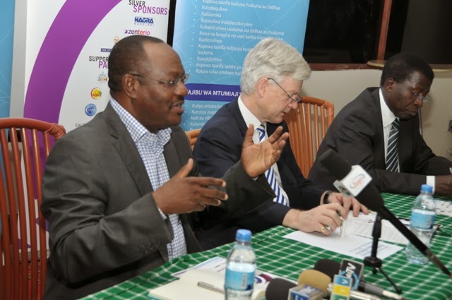 akizungumza na waandishi wa habari jijini Arusha leo Februari 10, 2014 juu ya Kongamano la 9 la CTO la mabadiliko ya mfumo wa utangazaji wa analojia kwenda Dijitali (DBSF) ambao utafanyika kuanzia 11 – 14 Februari, 2014 Naura Springs Hotel, Arusha Tanzania. Katikati ni Katibu Mtendaji wa CTO, Prof. Tim Unwin, akifuatiwa na Katibu Mtendaji wa Shirika la Mawasiliano Afrika Mahsriki (EACO) Hodge Semakula.