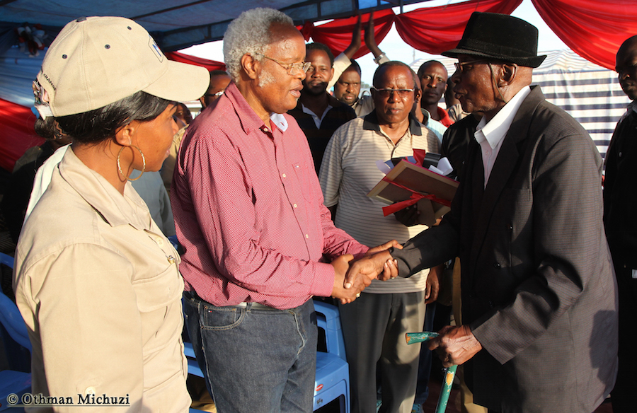 Waziri Mkuu wa Zamani, Fredrick Sumaye, akiwasalimia wananchi wa Mji wa Tarime waliokuwa wamefurika kwa wingi kwenye Uwanja wa Sabasaba, Tarime Mjini, Mkoani Mara Oktoba 10, 2015.