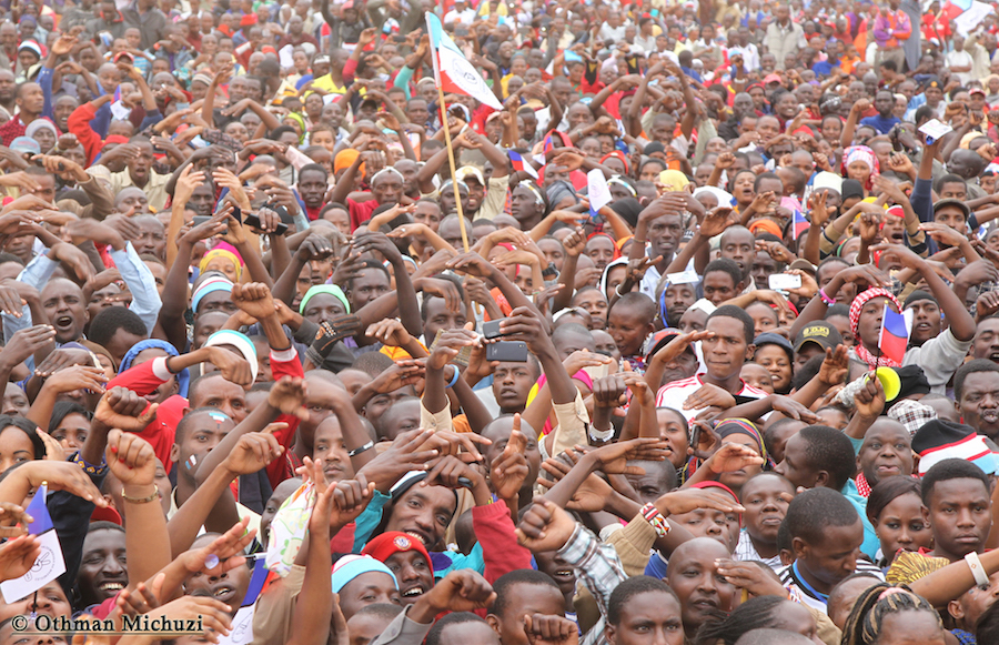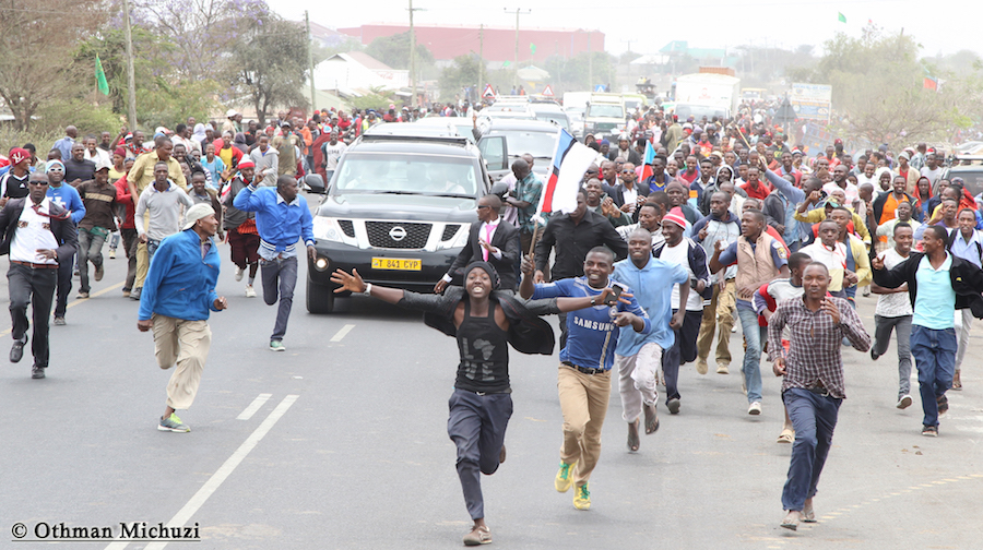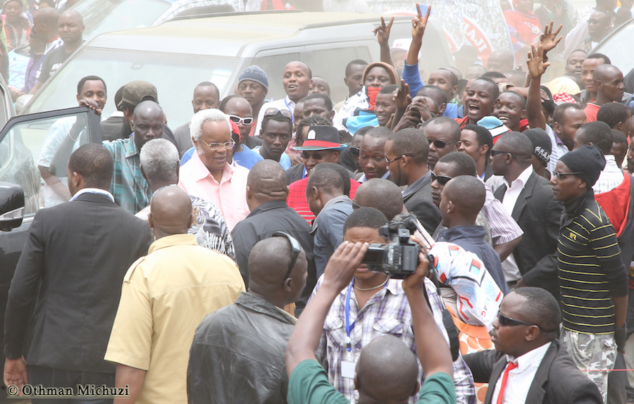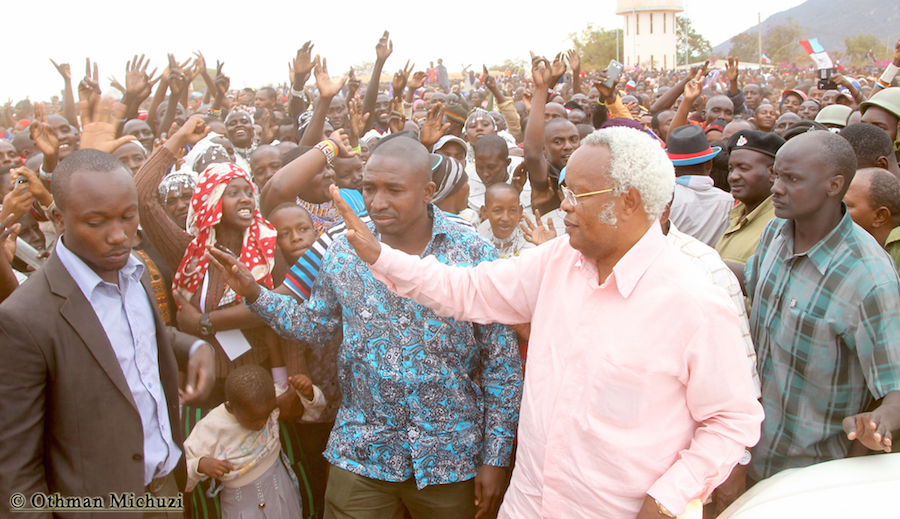 Mgombea Urais wa Chama cha Demokrasia na Maendeleo (CHADEMA) kupitia mwamvuli wa UKAWA, Edward Lowassa, akiwapungia wananchi wa Jimbo la Longido waliohudhulia Mkutano wa Kampeni zake, uliofanyika kwenye Uwanja wa Namanga, Jijini Arusha Oktoba 7, 2015.
