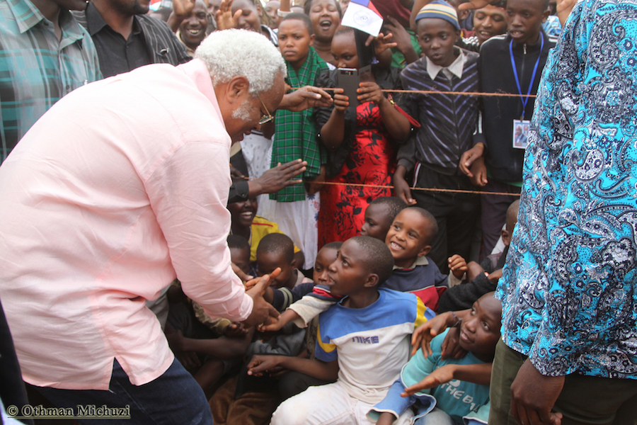 Mgombea Urais wa Chama cha Demokrasia na Maendeleo (CHADEMA) kupitia mwamvuli wa UKAWA, Edward Lowassa, akiwasalimia watoto walikuwepo kwenye Mkutano huo.