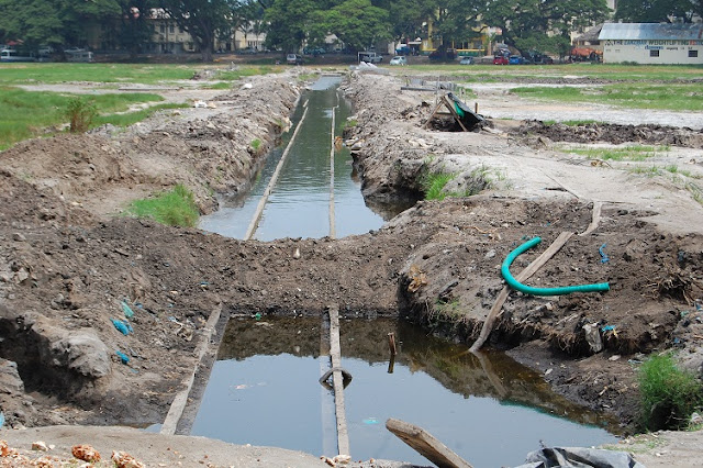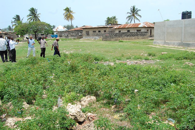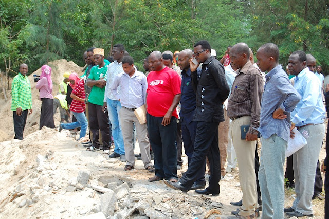 Makalbi ya mtaro wa kupitishia maji kutoka katika viwanja vya mpira mnazi mmoja yakitandikwa, na kulia ni mabomba ya mtaro huo ya zamani yaliokuwa yakitoa huduma hiyo ya kupitisha maji kutoka katika uwanja huo.