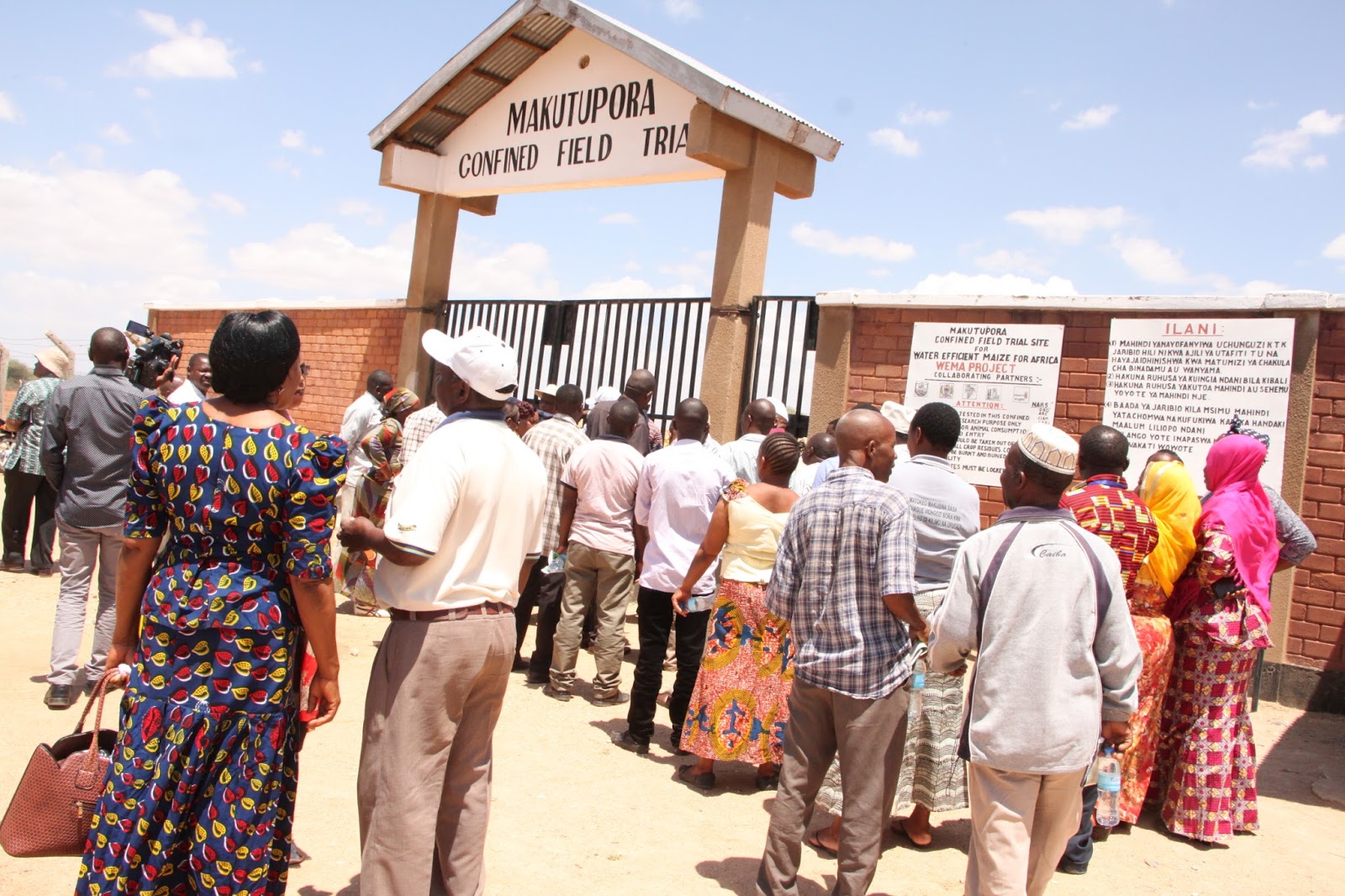 Wanahabari, watafiti wa kilimo, wenyeviti wa serikali za mitaa na watendaji wakiwa nje ya lango kuu la kuingia katika shamba hilo wakisubiri kupewa taratibu za kuingia.