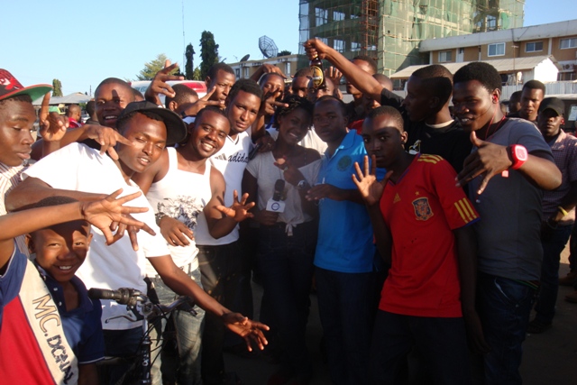Mussa Huseini pichani kati akiwa amezungukwa na Mashabiki/wapenzi wa tamasha la Serengeti Fiesta wakiwa wamejitokeza kwa wingi leo kwenye viwanja vya Biafra,wakati skwadi zima la lala salama kwenye kuelekea kilele cha tamasha la Serengeti Fiesta 2012 lilipotinga kwenye viwanja hivyo na kutoa zawadi mbalimbali kwa washabiki hao,ikiwemo fedha taslim,simu,tiketi za kuingilia kwenye tamasha hilo pamoja na fulana.