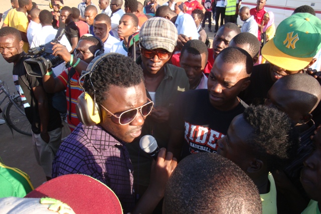 Mtangazaji wa Clouds TV,Mussa Husein akizungumza na mmoja wa mashabiki wa tamasha la Serengeti Fiesta 2012,ndani ya viwanja vya Biafra mapema leo jioni wakati skwadi zima la lala salama kwenye kuelekea kilele cha tamasha la Serengeti Fiesta 2012 viwanjani hapo