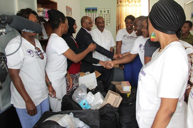 Rais wa Jumuiya ya Watanzania Washington Ndg Iddi akiungezani na Katibu Mkuu Afisi ya Rais Ikulu Mhe Salum Maulid baada ya makabidhiano ya madawa ya Binaadamu yaliotolewa na Madaktari Diaspora Washington. hafla hiyo imefanyika Wizara ya Afya Zanzibar.