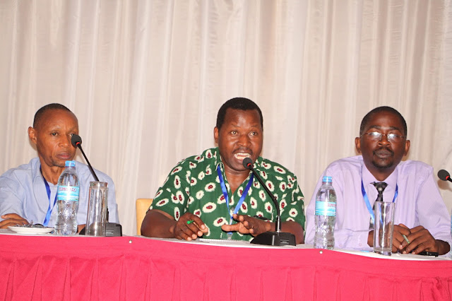 Dk.Chilolo Edward (katikati), akijibu maswali kuhusu changamoto ya waendesha bodaboda. Kushoto ni Profesa Andrew Swai na Dk. Manase Frank.