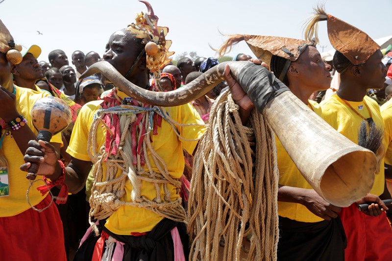 Mgombea Urais wa CCM Dk. Magufuli aliyenyanyua kofia (katikati) akiwasili katika uwanja wa CCM mjini Bariadi kwa ajili ya kuwahutubia kwenye mkutano wa kampeni mkoani Simiyu.