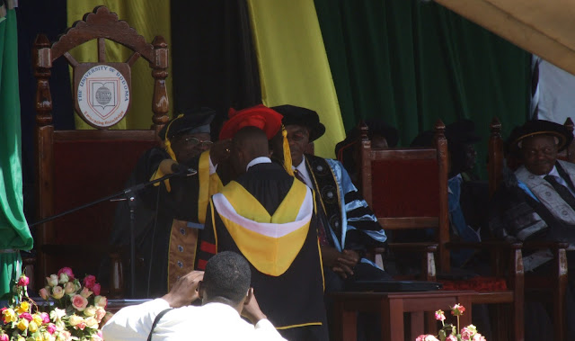 Mkuu Wa Chuo Kikuu Cha Dodoma (UDOM), Benjamin Mkapa akimtunuku Mhitimu wa Shahada ya Uzamivu Mmoja kati ya wahitimu wa tatu wa shahada ya juu kabisa ya Uzamivu ya Chuo Kikuu Cha Dodoma katika mahafali ya tatu ya Chuo Kikuu Cha Dodoma (UDOM) yaliyofanyika tarehe 22 Novemba 2012.