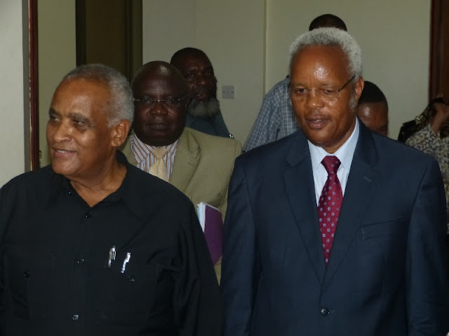 Waziri Mkuu Mstaafu na Mbunge wa Jimbo la Monduli, Edward Lowassa akiongozana na Katibu Mkuu Mstaafu wa uliokuwa Umoja wa Nchi huru za Kiafrika (OAU), Dr. Salim Ahmed Salim ambaye ni Makamu Mwenyekiti wa Tume ya Katiba, mara baada ya Lowassa kutoa maonai yake mbele ya tume hiyo.