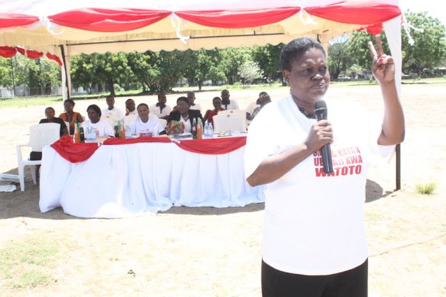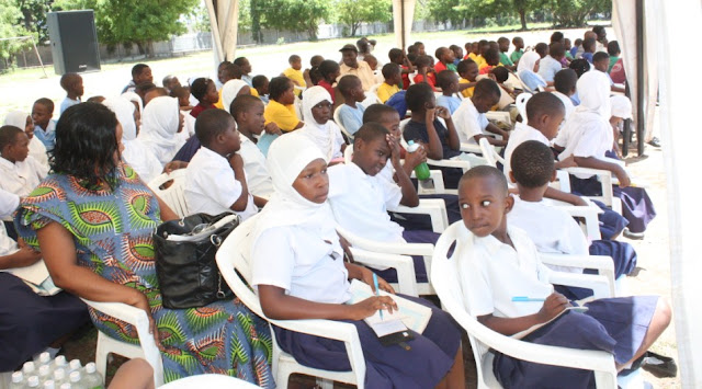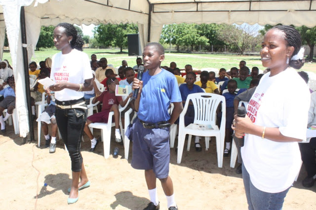 Mtoto wa shule ya msingi Hekima ya jiji Dar es Salaam akieleza machache kwa watoto wenzake, pembeni yake ni Mwakilishi wa Ustawi wa Jamii Kinondoni, Fransisca Makoye na mshereheshaji Zainab.