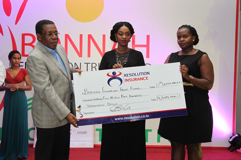 Mgeni Rasmi katika hafla hiyo, Ramadhan Madabida akipokea mfano wa hundi ya Sh. Mil. 4.4 kutoka kwa Mkuu wa Kitengo cha Masoko wa Kampuni ya Resolution Insurance, Angela Tungaraza (kulia). Katikati ni Mwenyekiti Mwanzilishi wa Bonnah Education Trust Fund, Bonnah Kaluwa.