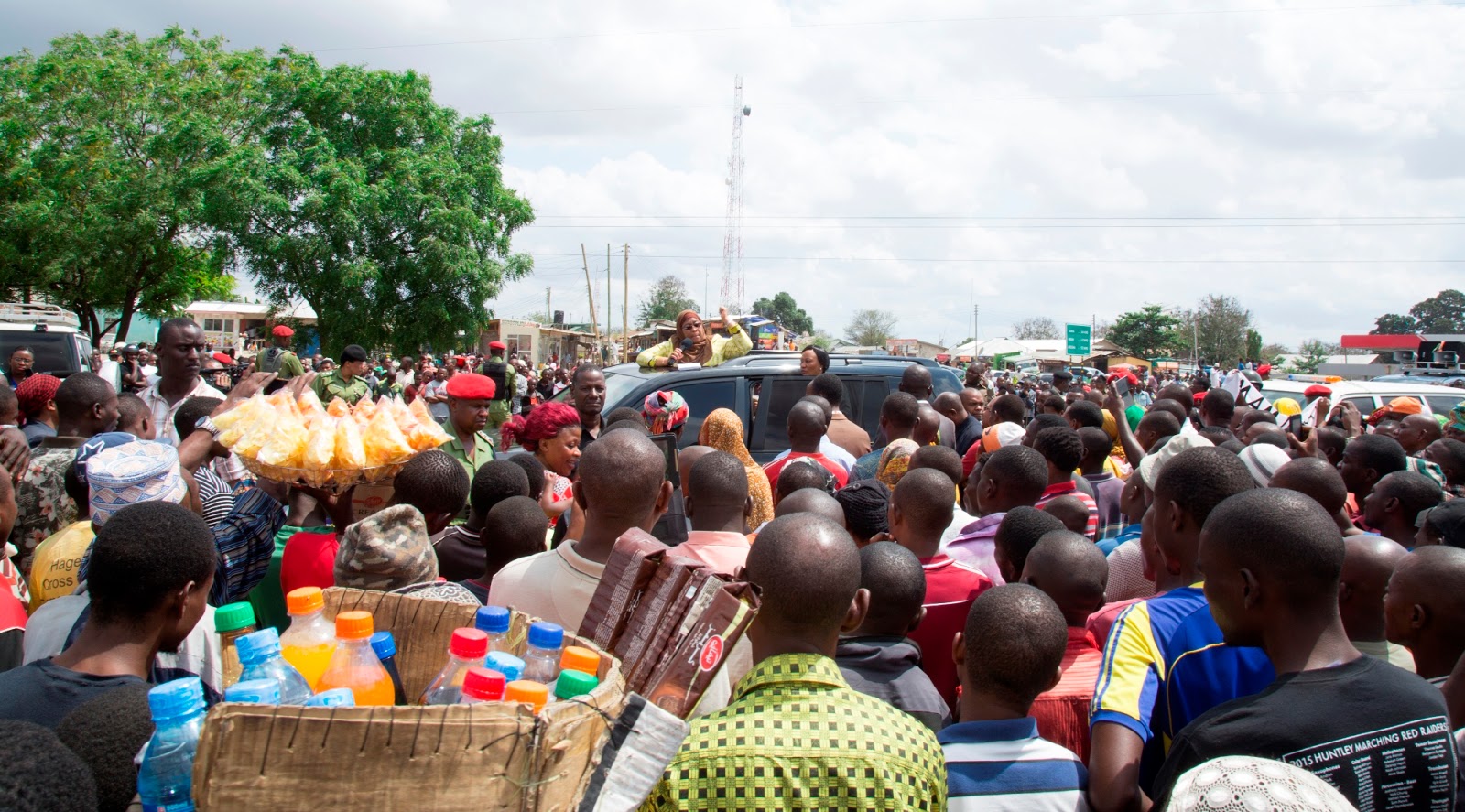 Wakazi wa Chalinze wakimsikiliza Makamu wa Rais wa Jamhuri ya Muungano wa Tanzania Mhe. Samia Suluhu Hassan aliyekuwa safarini kuelekea mkoani Dodoma ambapo atakuwa na ziara ya kikazi.