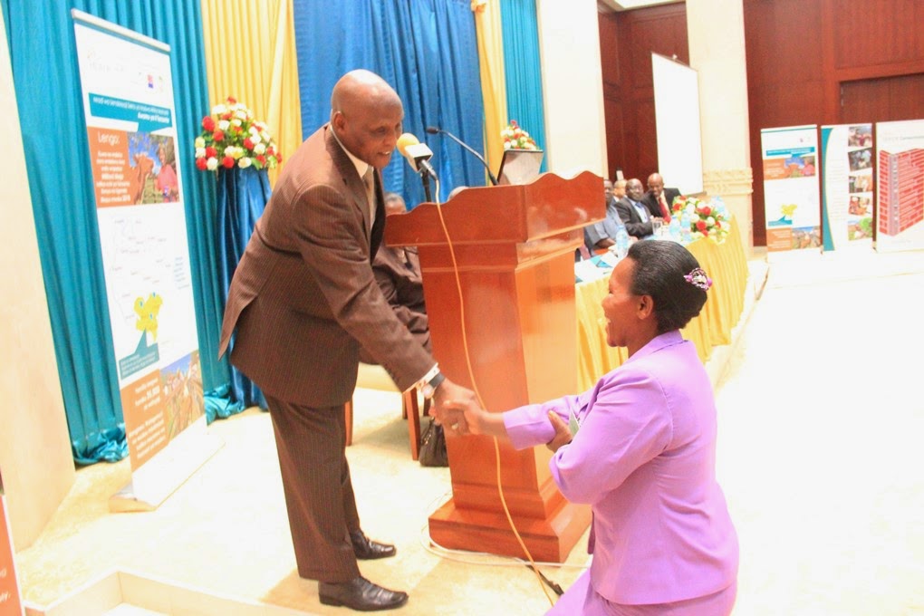 Mgeni Rasmi katika Uzinduzi huo ambae pia ni Naibu waziri wa Maendeleo ya Mifugo na Uvuvi, Mh Kaika Telele akimpongeza Mjasiliamali wa Waziwa kutoka Mkoani Iringa, Bi Diana wakati wa uzinduzi wa Mradi wa kuendeleza Sekta ya Maziwa Afrika Mashariki.