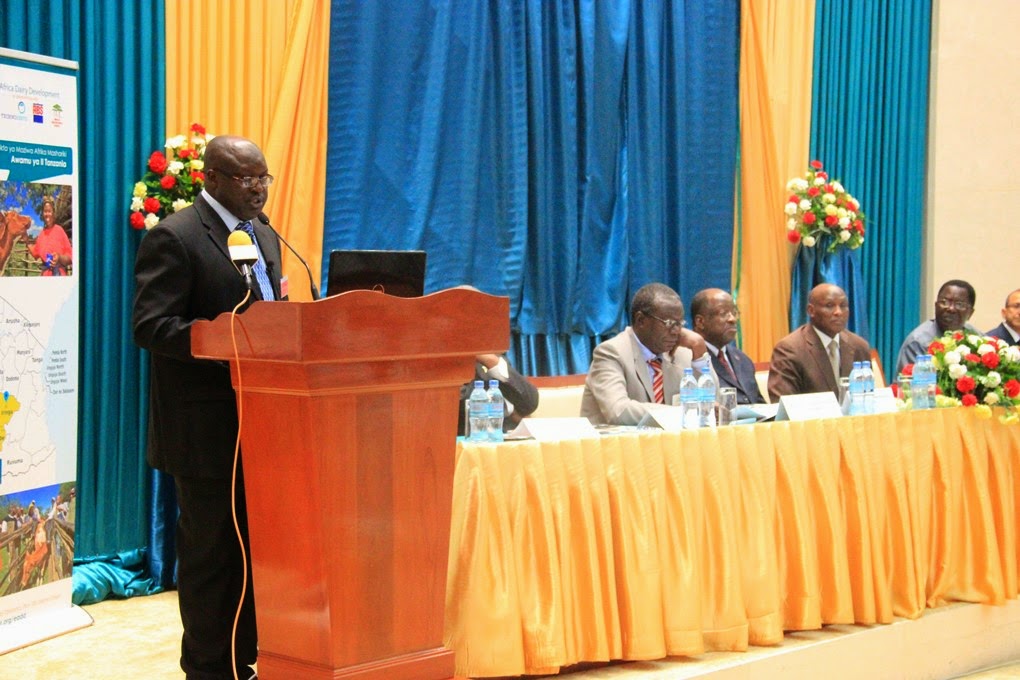 Naibu waziri wa Maendeleo ya Mifugo na Uvuvi ambae pia alikuwa mgeni rasmi katika uzinduzi huo, Mh Kaika Telele akiongea na wageni waalikwa na wadau wa sekta ya Maziwa Afrika Mashariki uliofanyika katika Ukumbi wa Kimataifa wa Mikutano wa Mwl Nyerere Mwishoni mwa Wiki.