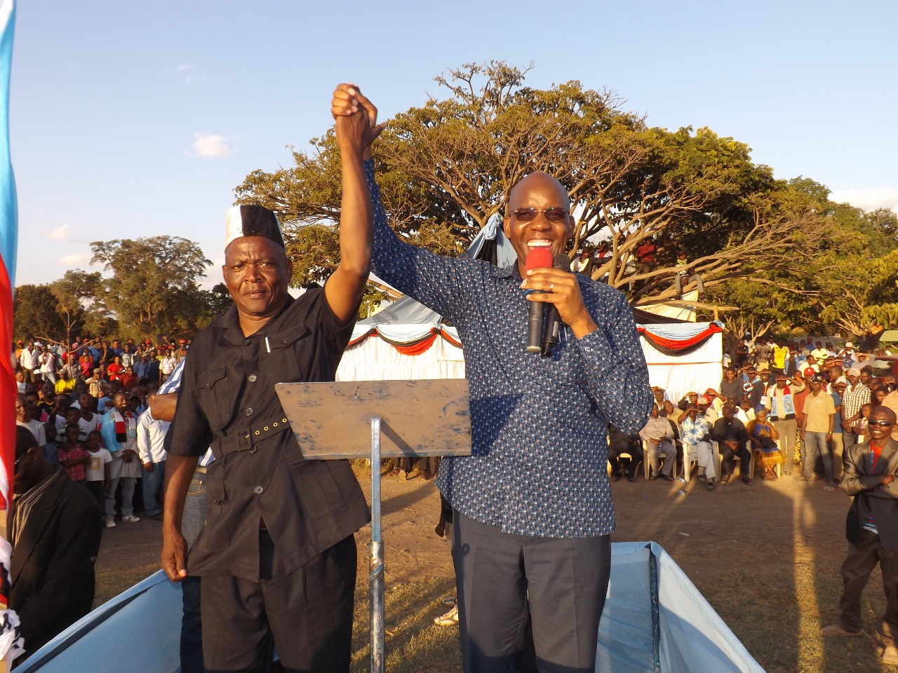 Mbatia akimtamburisha mgombea Ubunge katika jimbo la Moshi vijijini,Anthony Komu katika mkutano wa uzinduzi wa kampeni uliofanyika katika kata ya Arusha chini TPC. |