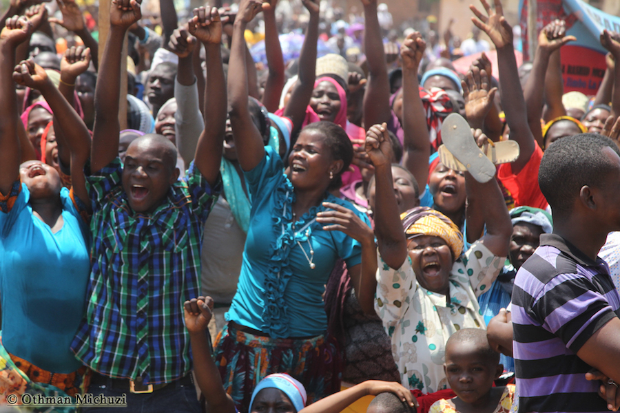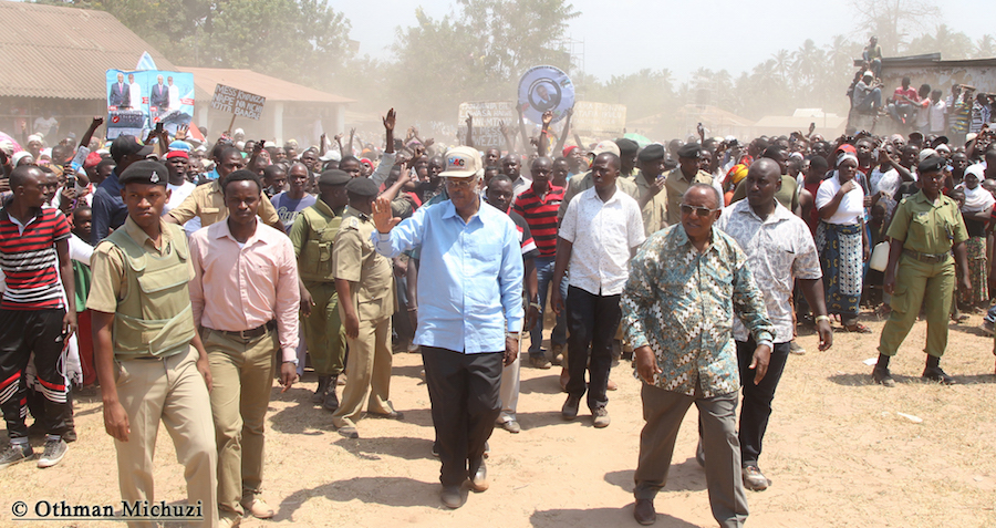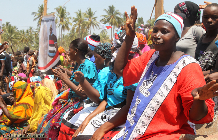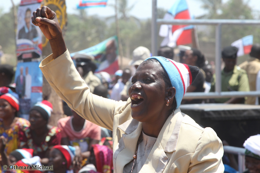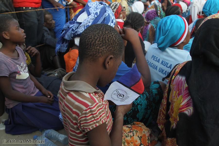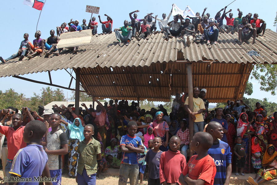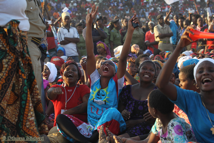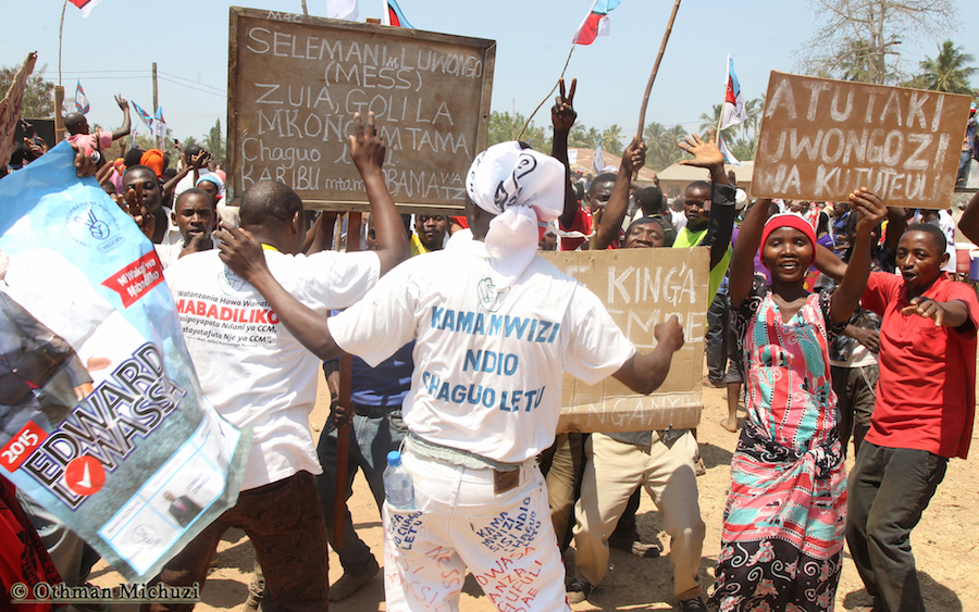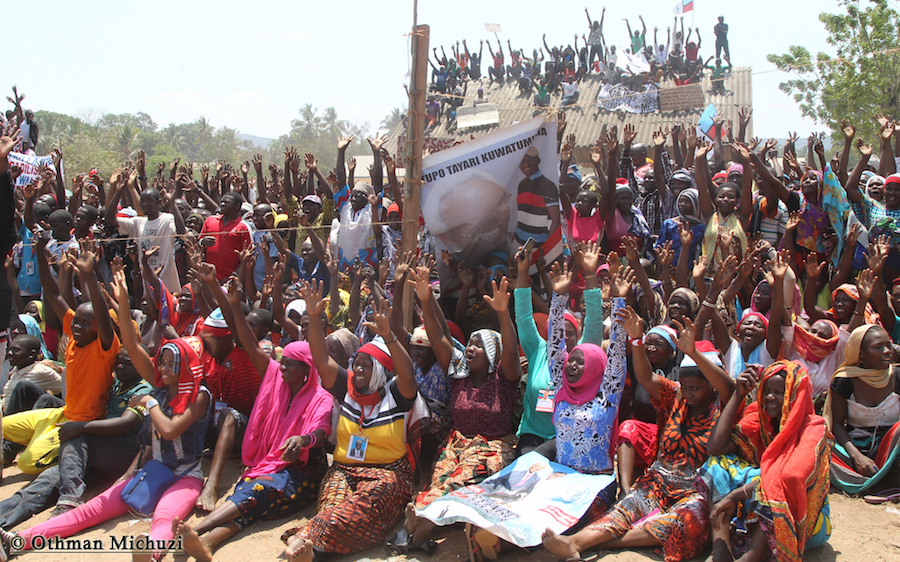 Wananchi wa Jimbo la Mtama, Mkoani Lindi wakifatilia Mkutano wa Kampeni za Mgombea Urais wa Tanzania wa UKAWA kupitia Chama cha Demokrasia na Maendeleo (CHADEMA), Edward Lowassa, uliofanyika kwenye Uwanja wa Soko la Majengo, Septemba 23, 2015.